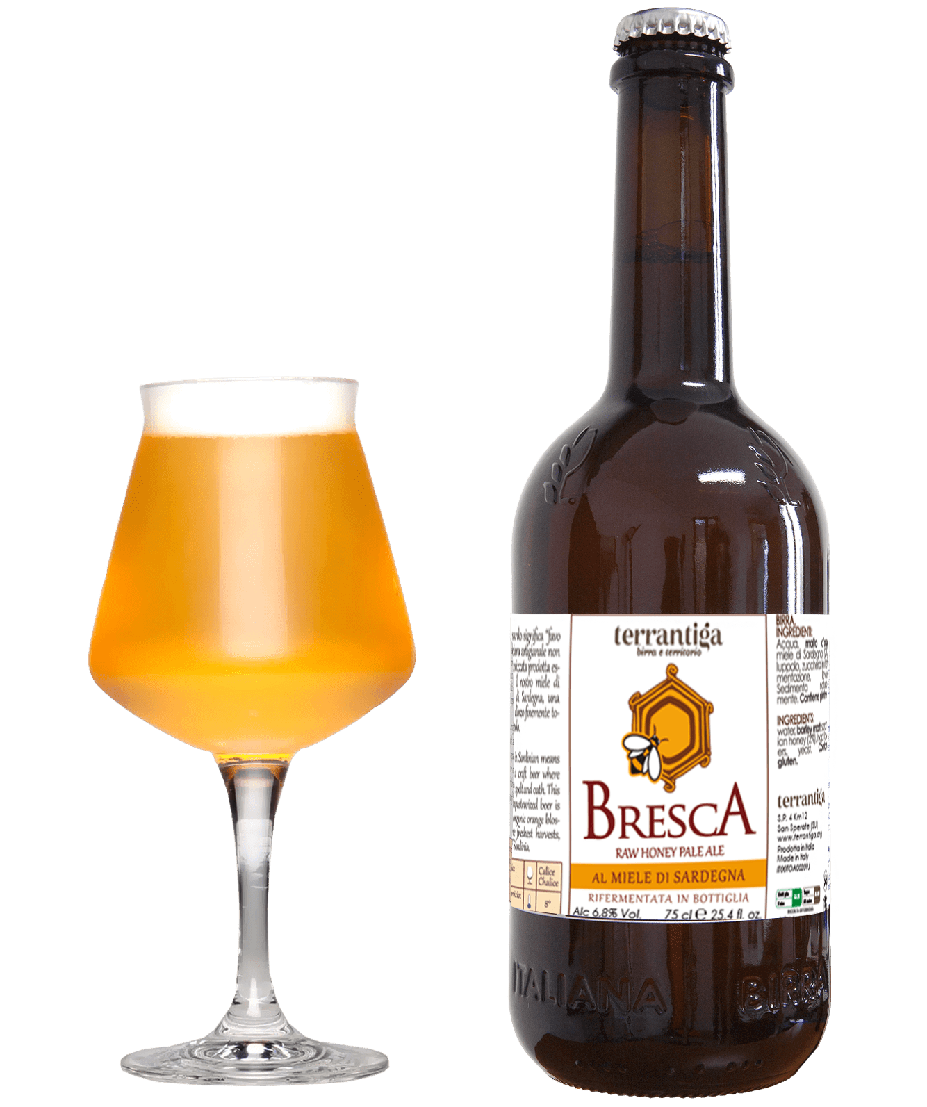 Ambachtelijk honingbier uit Sardinië. Birra Terrantiga Bresca 0.33L – gebrouwen met 20% biologische honing. Krachtig, bloemig.