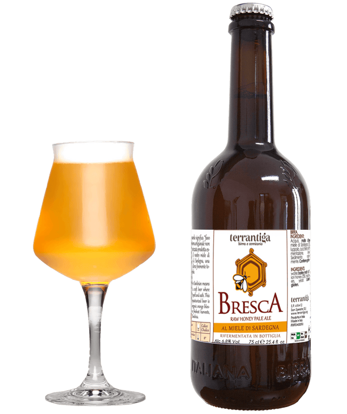 Ambachtelijk honingbier uit Sardinië. Birra Terrantiga Bresca 0.33L – gebrouwen met 20% biologische honing. Krachtig, bloemig.
